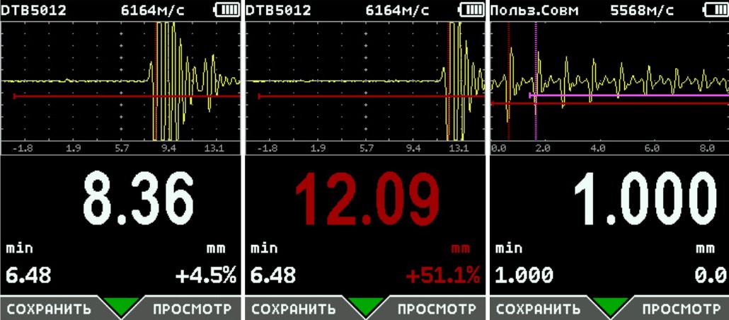- Режим А-СКАН – Основной режим работы толщиномера, предназначен для измерения толщины материала, на основе введенной оператором скорости распространения УЗ колебаний в материале исследуемого объекта с визуализацией радиосигналов на экране толщиномера. При этом на экране отображается текущее измеренное значение, минимальное измеренное значение, и отклонение от нормы в мм или %. Возможна работа совмещенным преобразователем по схеме ЭХО-ЭХО с двумя стробами