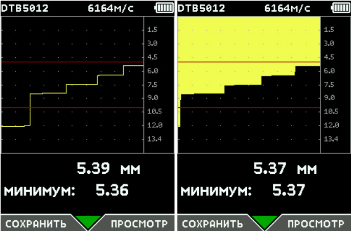 - Режим Б-СКАН – режим, позволяющий формировать профиль сечения исследуемой детали, с фиксацией минимального значения толщины. В этом режиме на экране отображается: графическое изображение профиля изделия Б-скан, текущее измеренное значение, минимальное зафиксированное значение толщины и курсоры установленных порогов отклонения от номинала (при включенной функции АСД). Возможно два типа графического отображения профиля изделия Б-скан с заполнением, Б-скан без заполнения