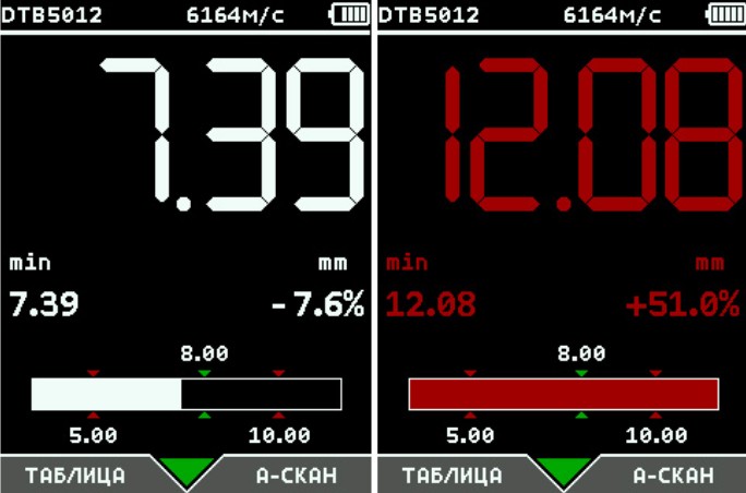 - АСД – управляемая система измерений, где возможно установить норму толщины для детали, и настроить пороги отклонения от нормы в мм или в % с цветовой сигнализацией выхода за установленные пределы